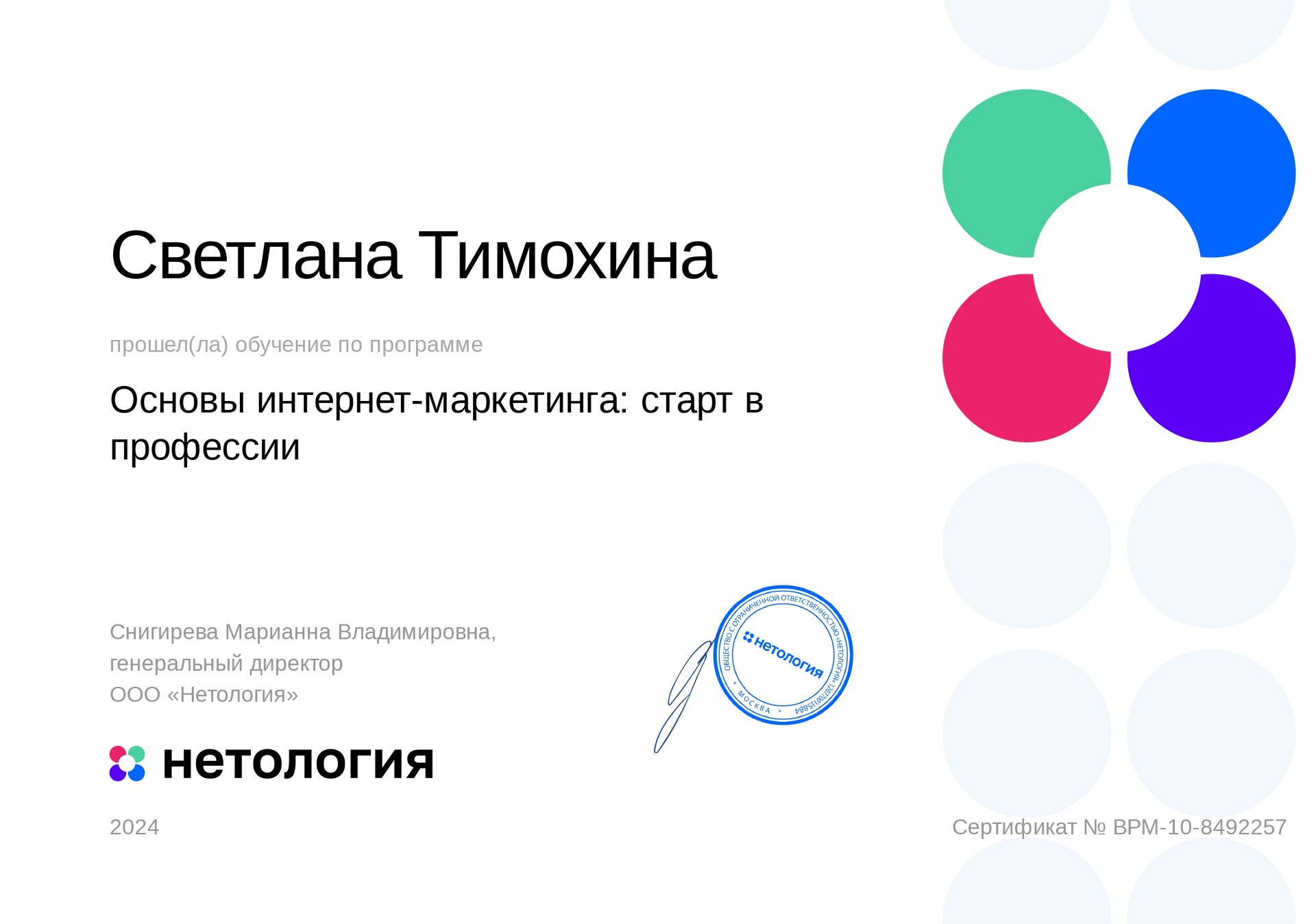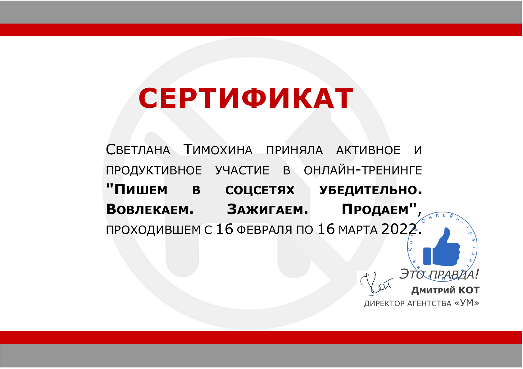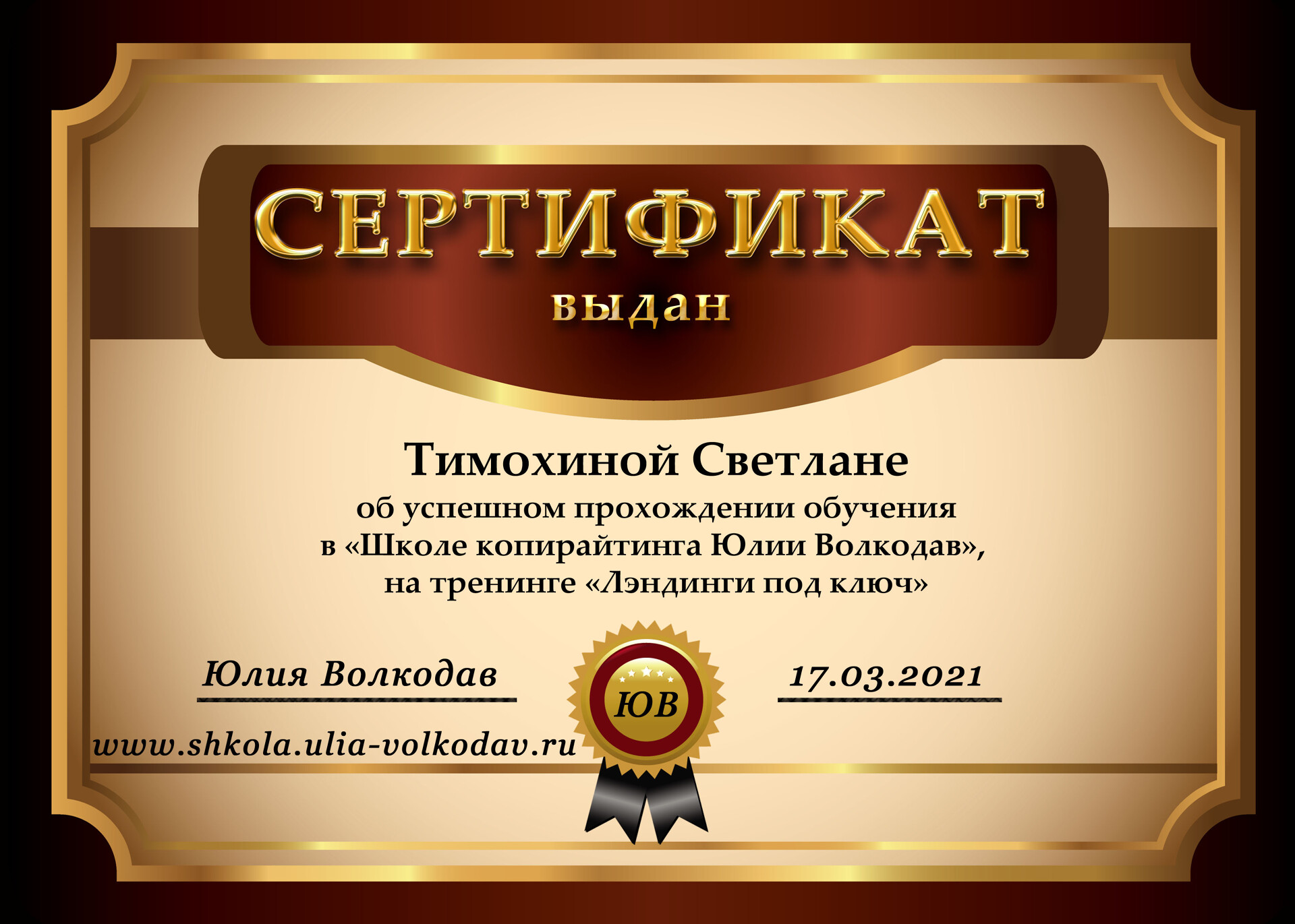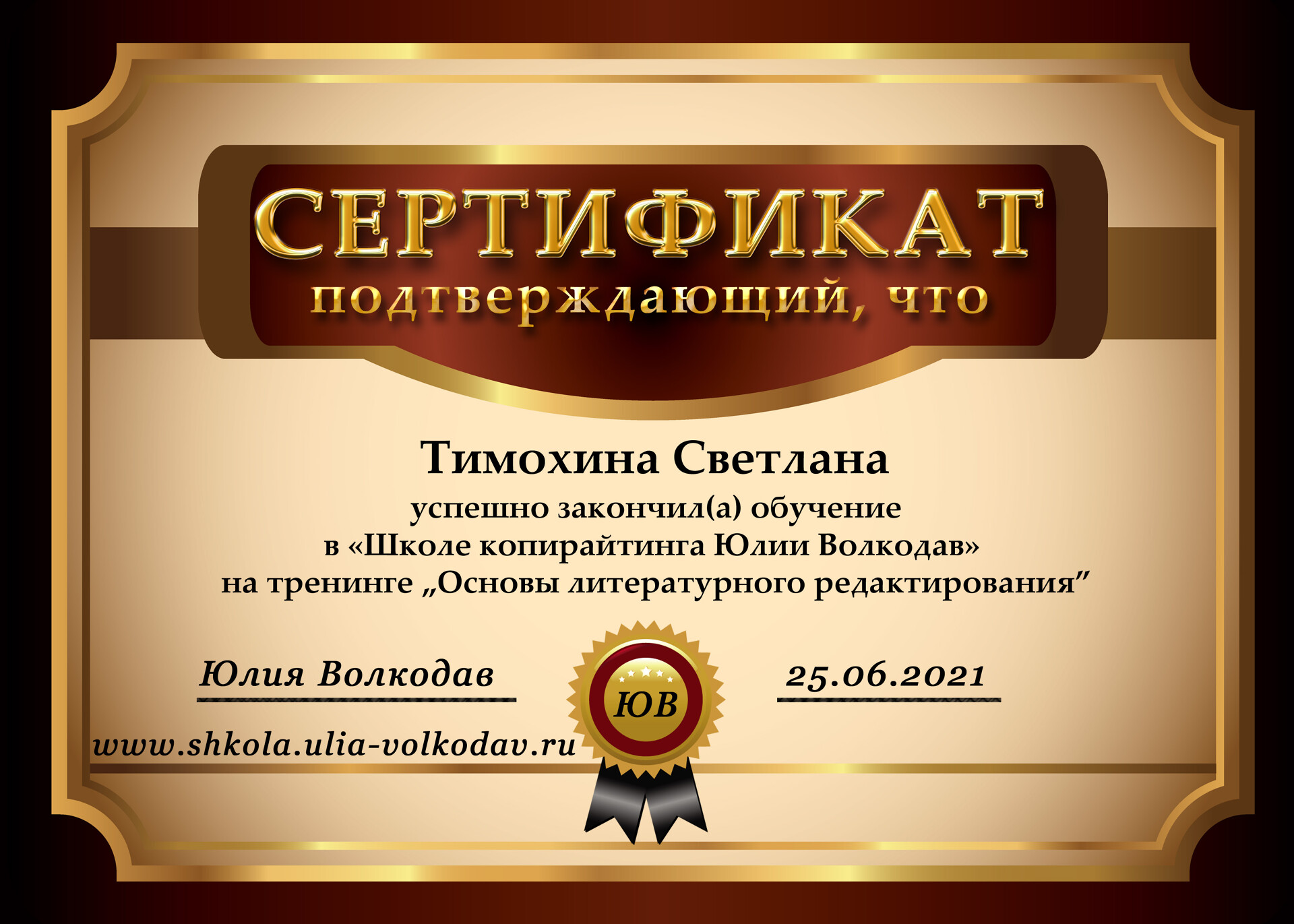 Прошла профессиональное обучение в Школе копирайтинга Юлии Волкодав, Школе маркетинга Дмитрия Кота и в Нетологии. Ежедневно повышаю свои квалификации: участник интенсивов Александры Гуреевой, вебинаров Деловой среды от Сбера.