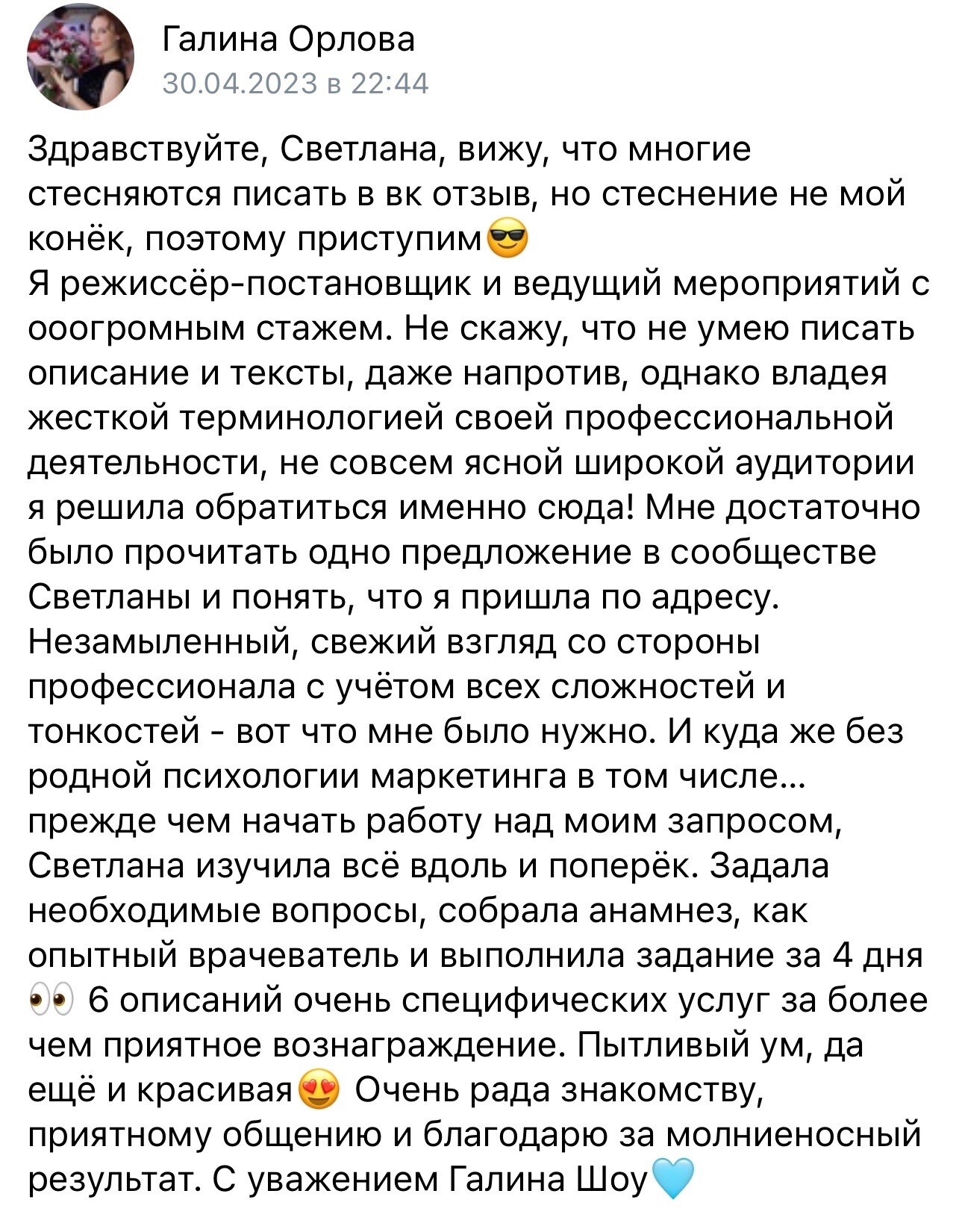 Я не использую нейросети, потому что это квазиинтеллект. Он не обладает способностью мыслить — он тупо агрегирует всё (в том числе и ересь), что вывалили до вас другие. И я НЕ хочу, чтобы контент моих заказчиков был лишь дешевой копией, возможно, даже недостоверных материалов. Я НЕ хочу, чтобы в итоге, когда все ресурсы окончательно заполнятся низкосортной литерой, контент моих заказчиков заболотился вместе с другими. Хочу, чтоб он сверкал. Понимаете?! Чтобы он конкурировал, выделял. Я как стремилась к уникальности, так и стремлюсь.